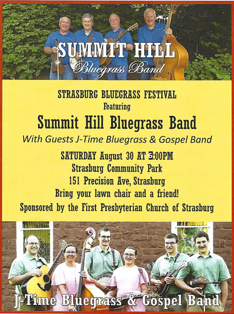 Come out and enjoy the Summit Hill Bluegrass Band, with guests J-Time Bluegrass & Gospel Band, at the Strasburg Community Park on August 30th beginning at 6 p.m.