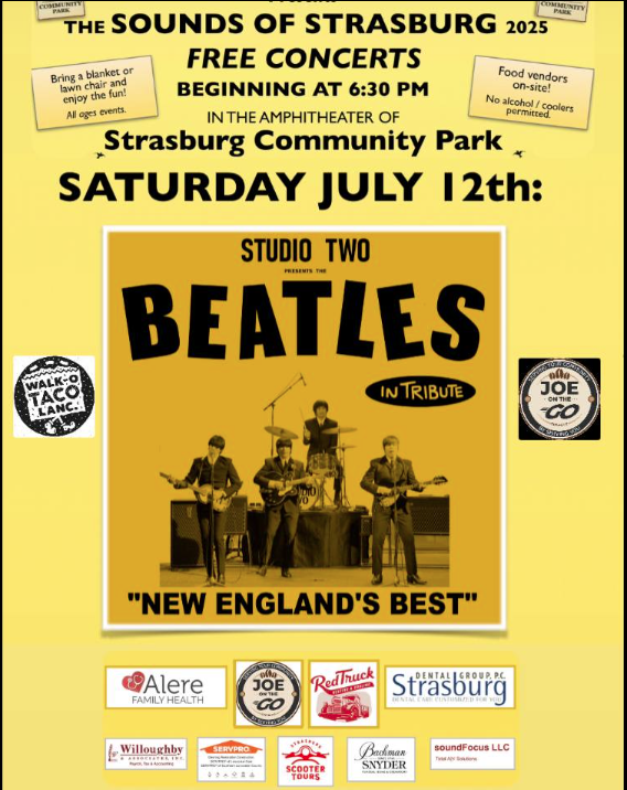Hailed as ‘New England’s Best Beatles Tribute Band’ by The Boston Globe, Studio Two will take their tour through the Northeastern United States to Strasburg July 12! Featuring the favorite hits of the early Beatles years, the group recreates the Fab Four’s music, appearance, instruments, and onstage banter to the delight of audiences everywhere. Comprised […] |