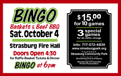 Join the community Saturday October 4, 2025 at the Strasburg Fire Hall for a fun evening to benefit Strasburg Community Parks Foundation and Strasburg Fire Company! Doors open at 4:30pm for Beef BBQ dinner to benefit the Strasburg Fire Company and to purchase bingo sheets and raffle basket tickets to benefit the Strasburg Community Park. […] |