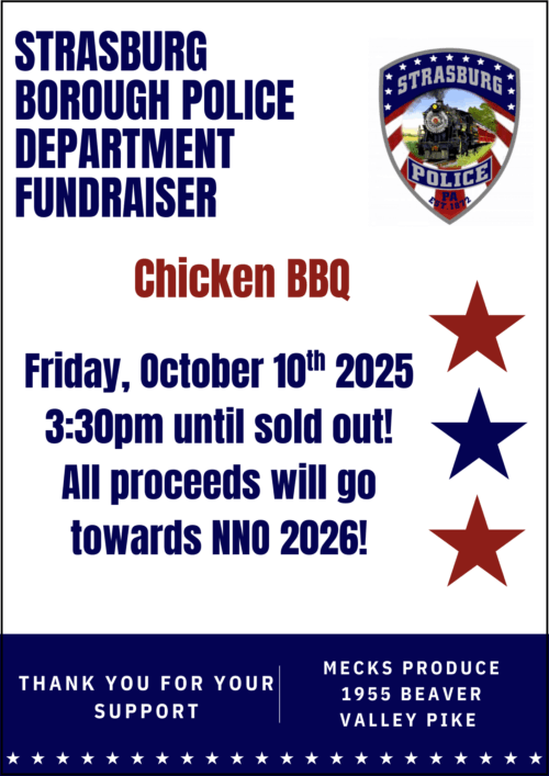 The Strasburg Borough Police Department will be having a Chicken BBQ fundraiser on Friday, October 10th at Meck's Produce, 1955 Beaver Valley Pike, Strasburg. This event will take place starting at 3:30pm and go until sold out. All proceeds will go towards next year's National Night Out (NNO). There are pre-order tickets available and can […] |